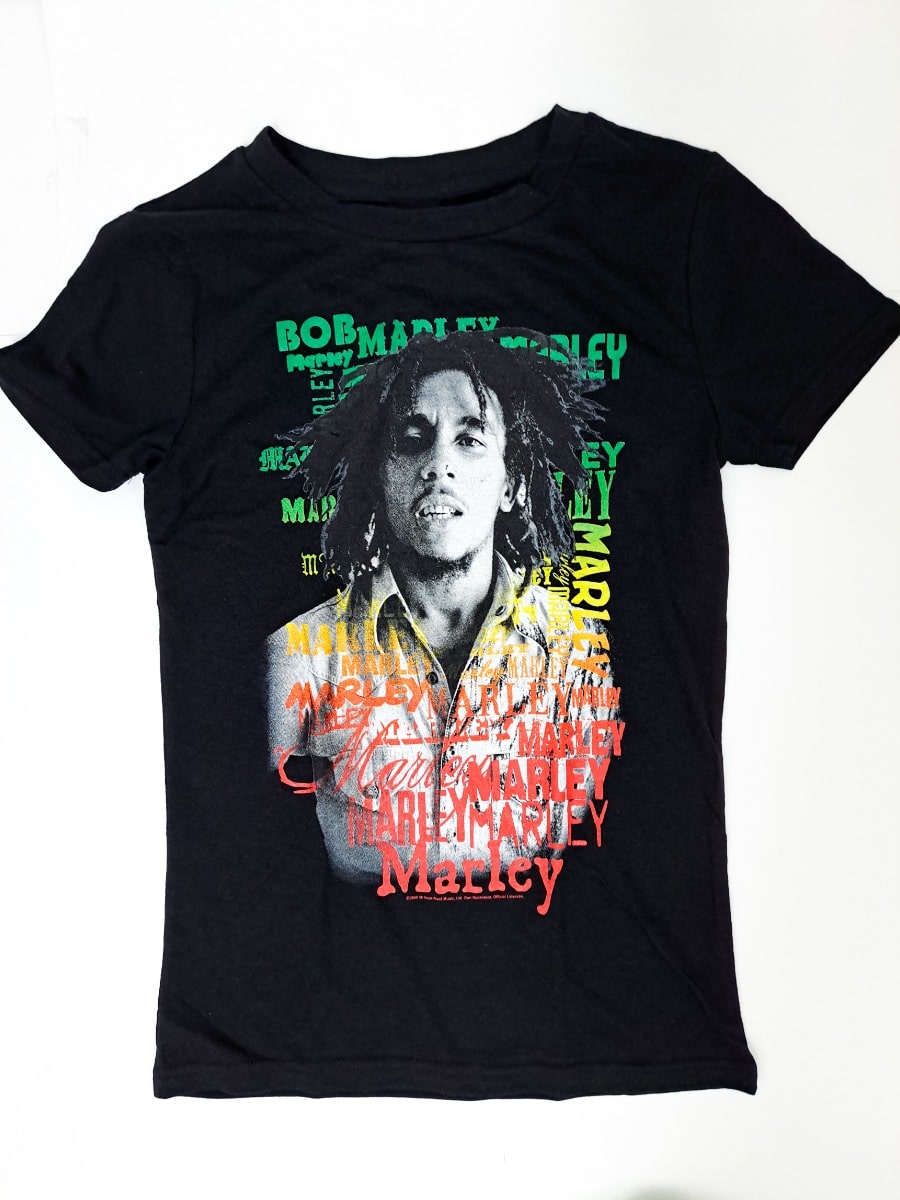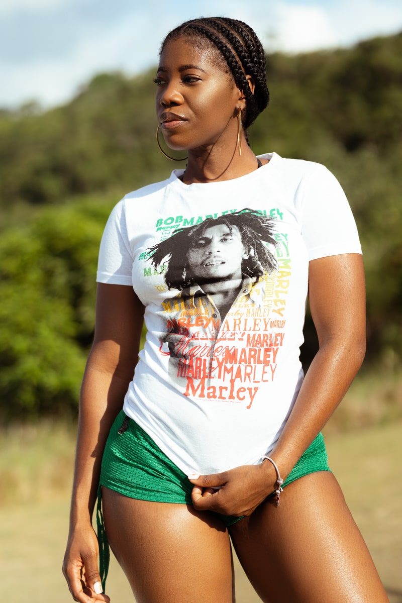 Rock the spirit of Bob Marley with this bold ladies' tee from the Bob Marley Foundation! A rustic image of the legend contrasts vibrant graffiti, blending vintage vibes with fresh style. Soft and comfy, it’s the perfect way to wear your love for Jamaica.