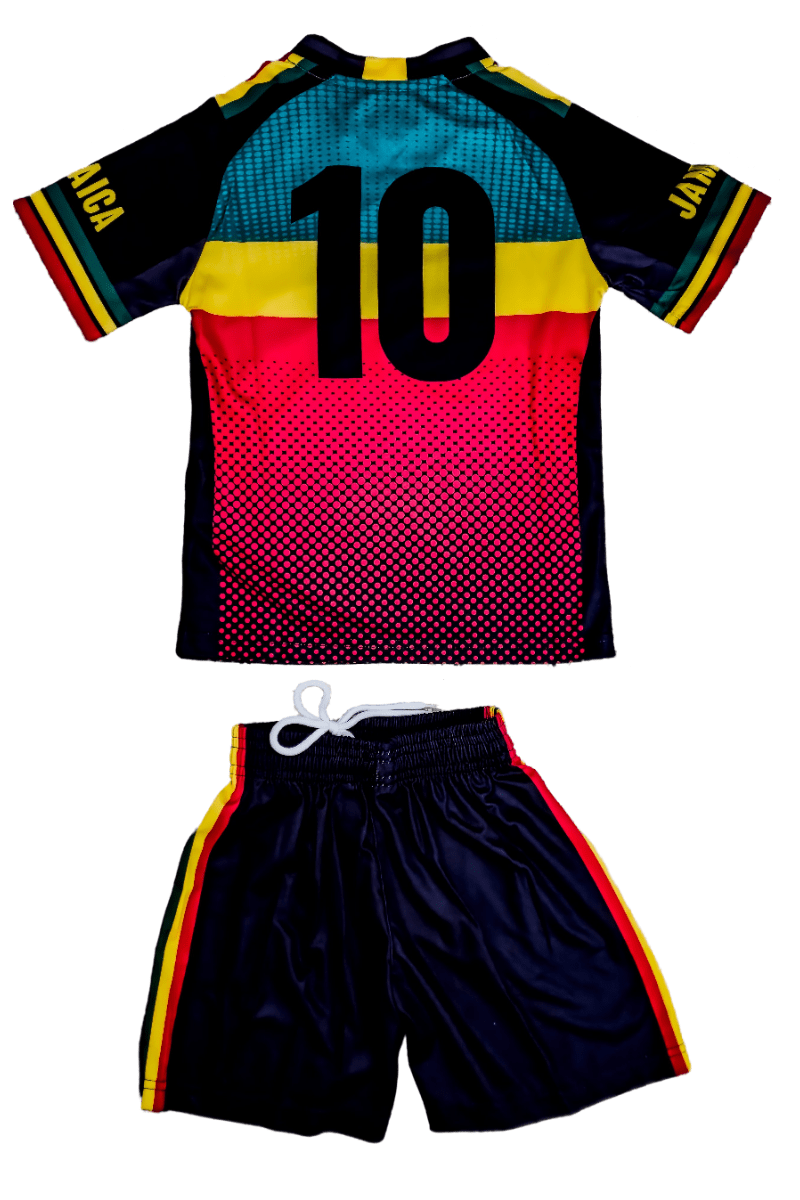 Showcase your little one’s reggae pride with this vibrant football set. The jersey and shorts are made from 100% polyester for durability and comfort, keeping them cool on the field. Bold reggae colors and the iconic ‘10’ on the back make it a standout look for young players and reggae fans alike. Perfect for play, pride, and style.